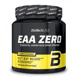 BioTech USA EAA ZERO je prášek esenciálních aminokyselin obohacený o L-glutamin. Naše tělo si tyto aminokyseliny nedokáže vytvořit samo, a proto je musí přijímat ve formě stravy nebo doplňků stravy. Součástí EAA jsou také známé aminokyseliny BCAA. Užíváním EAA ZERO si vždy zajistíte všechny esenciální aminokyseliny, čímž dosáhnete kvalitní regenerace, ochrany a růstu svalů. Jejich užívání se doporučuje také při redukčních dietách, kdy je třeba minimalizovat kalorický příjem.