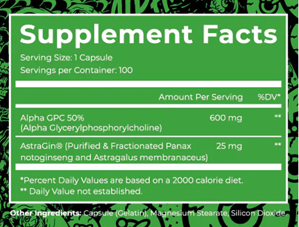 Dark Labs Alpha GPC 100 kapslí je doplněk stravy určený pro ty, kteří chtějí zvýšit kognitivní výkonnost, zlepšit soustředění a celkovou funkci mozku. Každá kapsle obsahuje 600 mg Alpha GPC, účinné sloučeniny cholinu, o které je známo, že podporuje zdraví mozku. Navíc obsahuje 25 mg AstraGinu®, směsi Panax notoginseng a Astragalus membranaceus, která pomáhá zlepšit vstřebávání živin a zajišťuje, že vaše tělo účinně využije Alpha GPC.