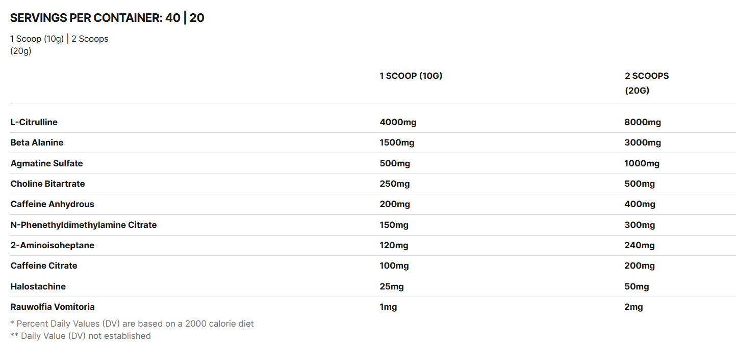 Mezi mimořádně účinné složky patří citrulin malát, karnosyn beta alanin, agmatin sulfát, arginin nitrát, kofein, DMHA a Grains of Paradise. V kombinaci a zejména ve vysokých dávkách tyto látky zajišťují zvýšení hladiny oxidu dusnatého, prokrvení organismu a zvýšení přísunu kyslíku. Díky tomu získáte obrovskou energii a sílu. Účinné látky navíc zajišťují naprosté soustředění na trénink a cviky pro přesnější provedení a více opakování. A to vše v té nejlepší náladě!