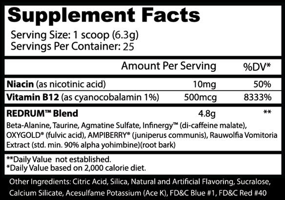 Redrum je zářným příkladem vysoce kvalitní předtréninkové formule s vysokým obsahem stimulantů. Nenabije vás pouze kofeinem, ale dodá vašemu tělu a mysli sílu pomocí vědecky podložených složek. Pokud vás už nebaví brát si několik odměrek předtréninkového přípravku, dochází vám energie před dokončením kardio tréninku nebo vás nebaví vypít tři šálky kávy, jen abyste se rozjeli - vyzkoušejte Redrum. Nebudete zklamáni.