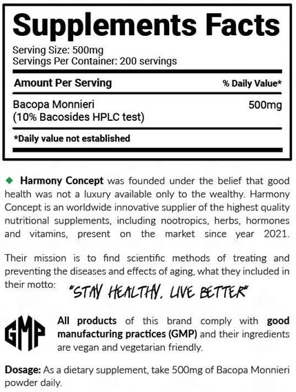Harmony Concept Bacopa Monnieri je vysoce kvalitní extrakt z Bacopa monnieri obsahující 10 % bakosidů, standardizovaný metodou HPLC – nejlepší kvalita na trhu!