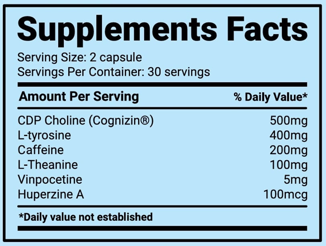 100 mcg huperzinu A – silný inhibitor acetylcholinesterázy, který zabraňuje rozkladu acetylcholinu a zlepšuje kognitivní funkce, jako je paměť, učení a pozornost.