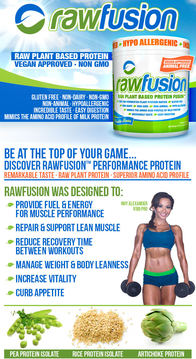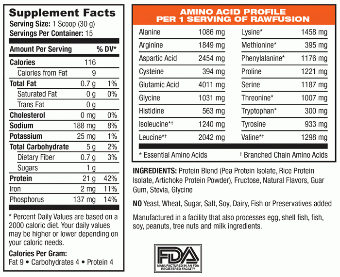 Exkluzívna zmes RAWFUSION s obsahom bielkovín hrachu, naklíčeného koncentrátu bielej ryže, koncentrátu artičokového proteínu a slnečnej olejovej matrice bohatej na EFA poskytuje tento patentový vzorec, ktorý je ideálny pre vegánov a je vysokoproteínovou a rozumnou voľbou aj pre nevegánov. V skutočnosti, s viac ako 4,5 gramami BCAA na porciu, aminokyselinový produkt RAWFUSION súperí s mliečnymi proteínmi, ale bez akýchkoľvek nevýhod mliečnych alebo živočíšnych bielkovín.
